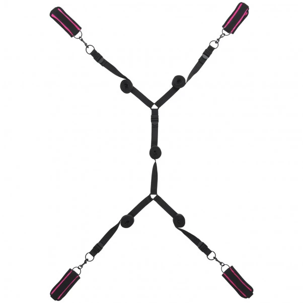 Legg stroppene under madrassen, og sørg for at mansjettene stikker ut på hvert sitt hjørne av sengen. Fest de rosa, detaljerte mansjettene rundt ankler og håndledd på din lekekamerat, som enten ligger med ansiktet opp eller ned.