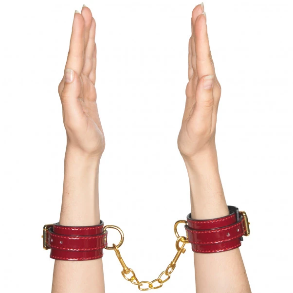 Gjør deg klar til å overgi deg på den mest spennende måten til disse røde, skinnende håndleddsmansjettene med gullspenne-detaljer.