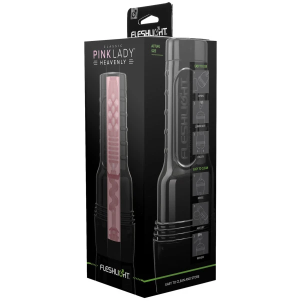 Opplev himmelsk nytelse med Fleshlight Pink Lady Heavenly Masturbator. Det stramme grepet rundt penis stimulerer deg med den dreide indre strukturen, de pirrende rillene og de stimulerende knoppene.