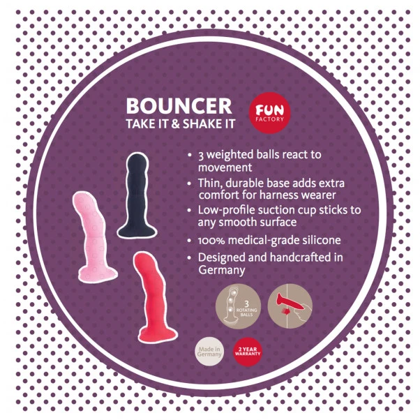 Fun Factory Bouncer Shakedildo har en frekk hemmelighet under det deilige silikone. Den har 3 innebygde kuler som roterer og dildoen er verdens første «shakedildo».