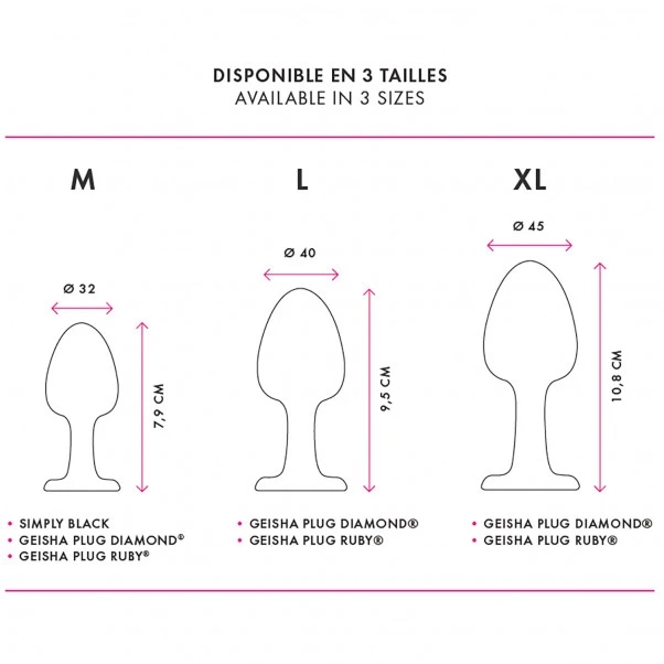 Anal Geisha Plug er i størrelsen large og har en diameter på 4 cm på ditt bredeste punkt. Den har en lengde på 9,5 cm, hvor ca. 8 cm kan føres inn. Det følger med en fin oppbevaringspose.