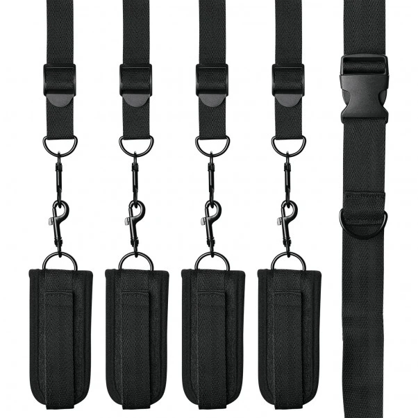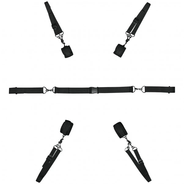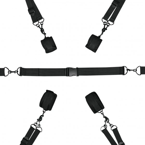 Settet inkluderer midjebelte og myke, håndjern og ankelmansjetter, alt er ultrajusterbart for en perfekt passform. Hver mansjett er festet til sin egen justerbare stropp med en krok for å feste til sengen. Beltet går rundt livet og har to ringer for å feste, en på hver side. Den medfølgende stroppen som kan justeres opptil 520 cm festes til ringen på den ene siden av beltet, føres deretter under madrassen din og kommer opp på andre siden for å festes på den andre siden av beltet, slik at du holder deg limt til sengen for et virkelig paradis for BDSM.