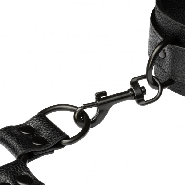 obaie Imitert Skinn Hogtie med Mansjetter består av en 4-veis hogtie, to håndleddsmasjetter og to ankelmansjetter. Samtlige deler er laget av lekkert, svart PU-skinn og nikkelfritt metall.
