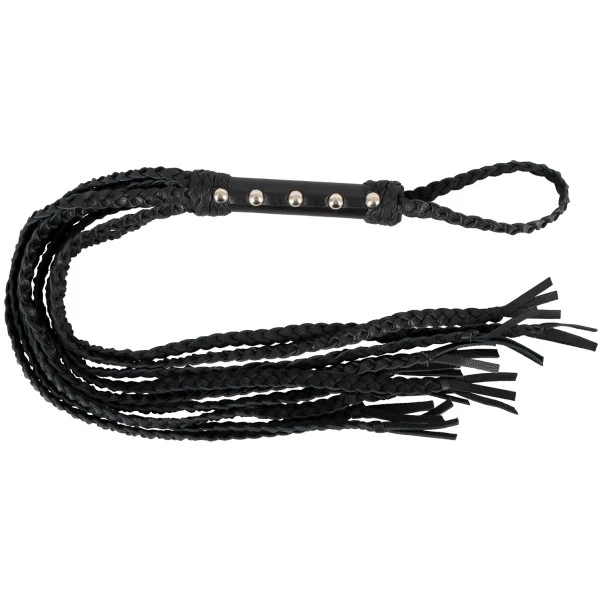 Både nybegynnere og avanserte deltagere vil finne glede i å svinge denne lange skinnfloggeren. Med flettede frynser og et håndtak utsmykket med sølvpigger er floggeren et elegant BDSM-tilbehør som kan dele ut tirrende kjærtegn og skarpere slag.